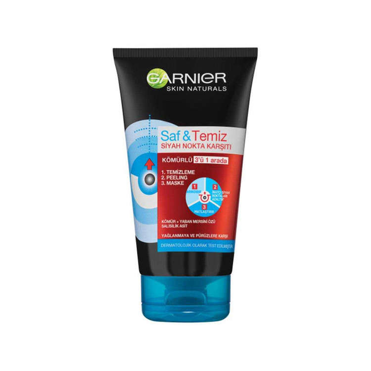 ماسک سه کاره گارنیر فرمولی عالی را برای پاک کنندگی پوست ،رفع انسداد منافذ ،حذف سلول های مرده ودر نهایت مات کردن پوست ارائه می دهد امولسیون تمیز کننده و ضد باکتری موجود در آن با کمک مواد معدنی آلودگی و سموم اضافی پوست را از بین می برد تا از بروز جوش و آکنه در آینده جلوگیری کند از بین برنده جوش های سر سیاه ، حاوی زغال فعال پاک کننده پوست ،رفع چربی اضافه پوست ،لایه بردار ،دارای اسید سالسیلیک ، رفع آکنه و جوش سر سیاه ،شفاف کننده و نرم کننده ،کوچک کننده منافذ پوست از این محصول به صورت روزانه به عنوان پاک کننده پوست و دوهفته در میان جهت اسکراب ولایه بردار صورت و هفته ای یک بار به عنوان ماسک صورت استفاده نمایید