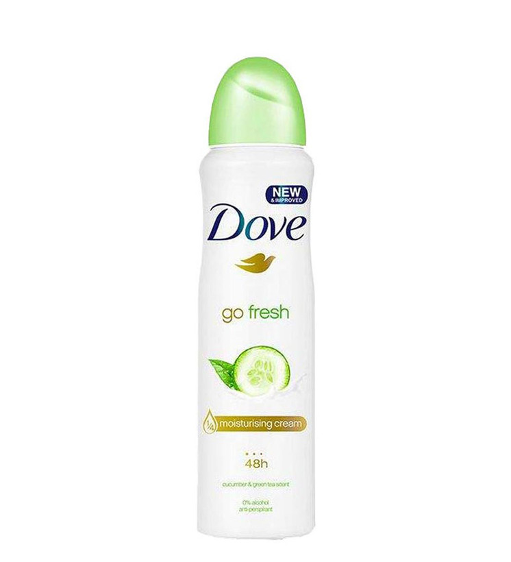اسپری داو Go Fresh اسپری ضد تعریق مخصوص خانم ها است و به بهبود ظاهر طبیعی پوست و زیبایی پوست زیر بغل کمک می کند. این اسپری داو، خاصیت ضد تعریق با ماندگاری بالا دارد و از عرق کردن تا 48 ساعت جلوگیری می کند و تا مدت طولانی در طول روز احساس تازگی به فرد می دهد. همچنین فرمولاسیونی بدون الکل داشته و خارش پوست ناشی از شیو کردن مو را کاهش می دهد. اسپری داو Go Fresh با مواد مرطوب کننده ای که دارد سبب تغذیه پوست شده و به نرم و لطیف ماندن پوست زیر بغل کمک می کند و بوی طراوت بخش خیار و چای سبز دارد.